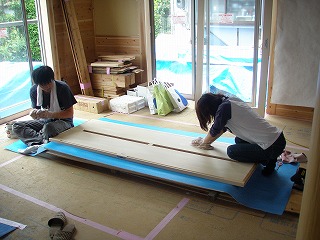 桧のフローリングを張っているのは、スーパー大工・山田ハン。床の張仕舞は難しい