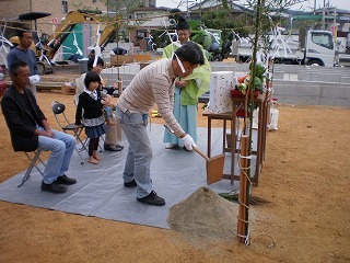 次に施主様が鋤で盛り砂をすくいます