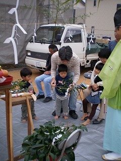 最後に棟梁が鍬で砂をかけます