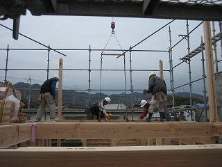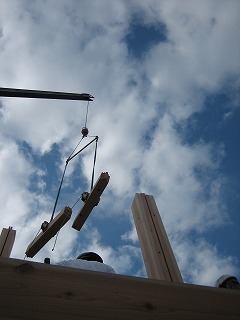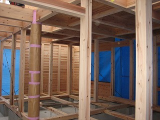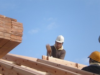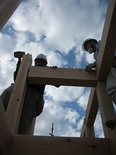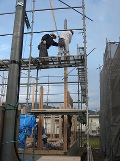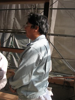 階下で棟梁が作業中。