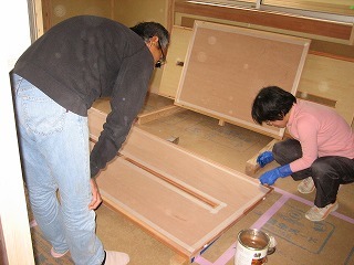 打合せ後は、建具のワックス指導。